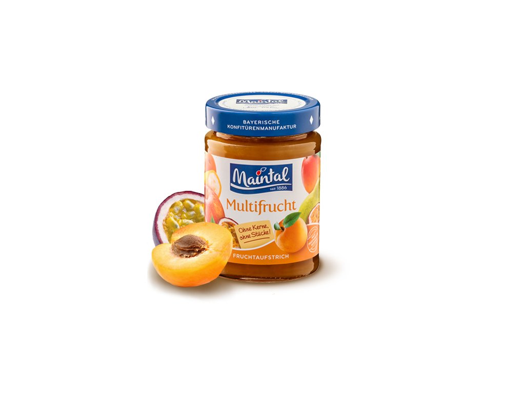 Plná rozmanitost nedotčené přírody na Váš stůl. Nový džem z takzvaného multiovoce je navíc připraven podle starého rodinného receptu - intenzivně ovocný a plný chuti. Smícháme chuť jablka, meruňky, hrušky, marakuji, manga a banánu dostaneme úžasnou šťavnatou aromatickou chuť. Jemná pochoutka na váš snídaňový stůl - bez kousků, bez semínek. Je vhodná také jako lahodná povrchová úprava mléčných výrobků, jako jsou koktejly, jogurty nebo zmrzlina. Džem je výborný také do dortu, buchet, na palačinku nebo lívance.